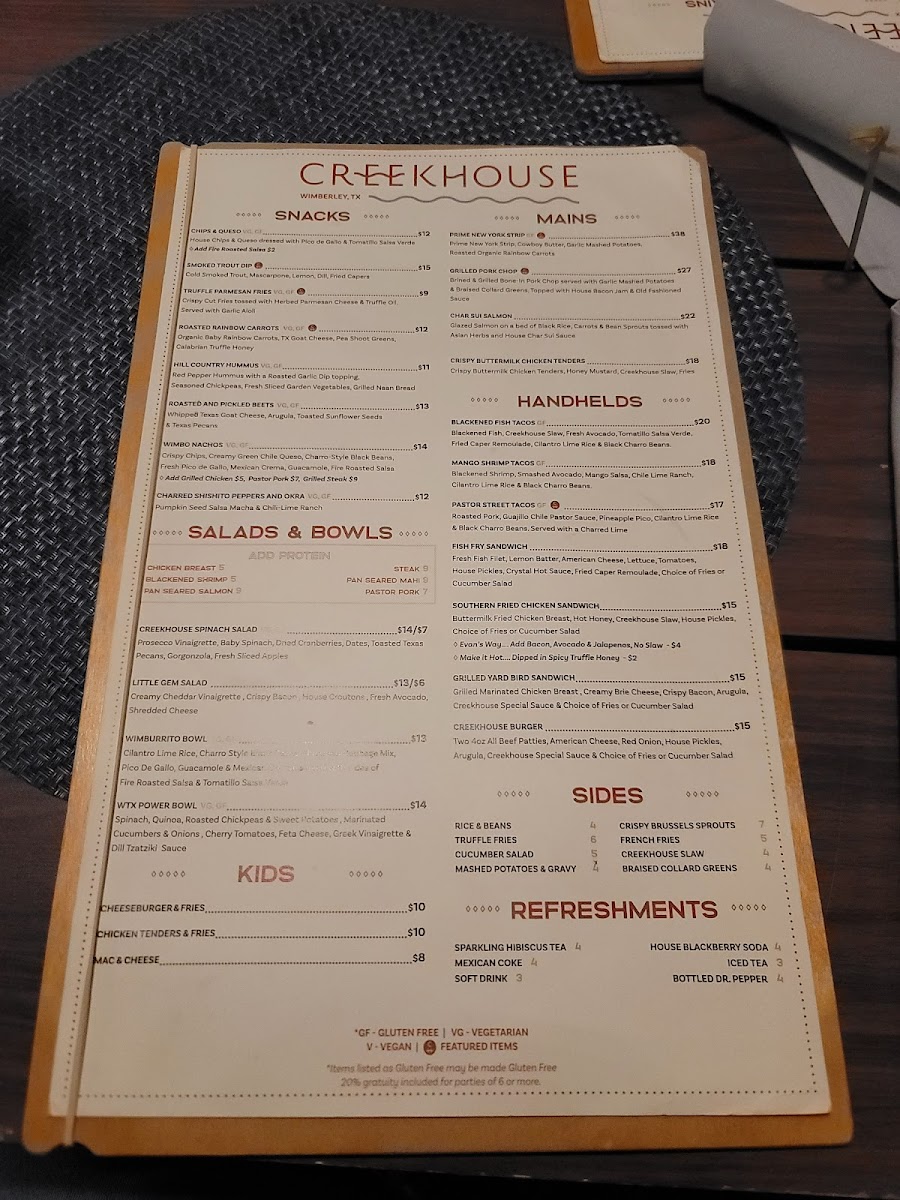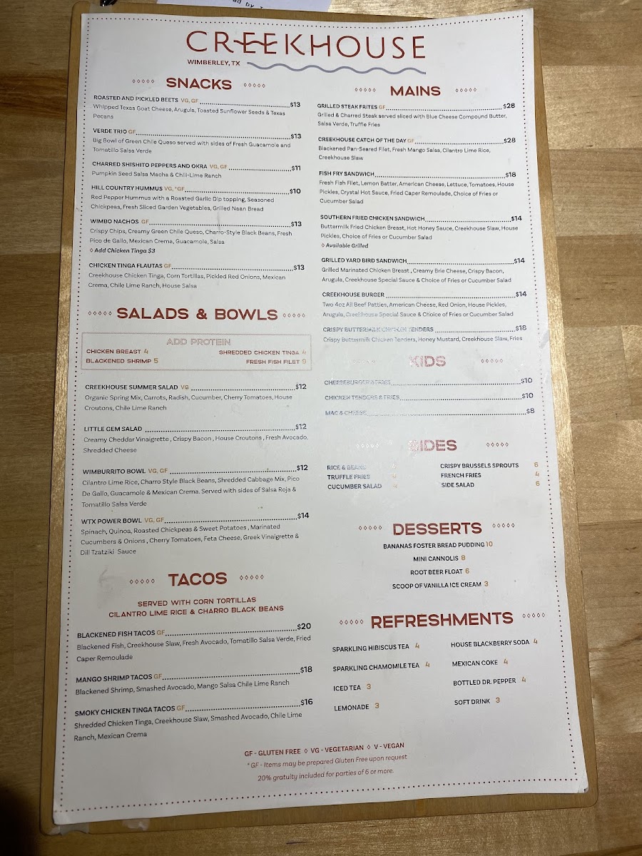 The menu showcases a variety of dishes, from the Mango Shrimp Tacos to the Wood-Grilled Steaks, ensuring there’s something for everyone’s palate. Don't overlook the highly-praised WTX Power Bowl and delectable desserts like bread pudding that are the perfect ending to a memorable meal. With a cozy ambiance, attentive service, and a selection of craft cocktails and local brews, Creekhouse delivers an unforgettable dining experience ideal for both special occasions and casual meals. Make a reservation to savor this unique culinary haven.
